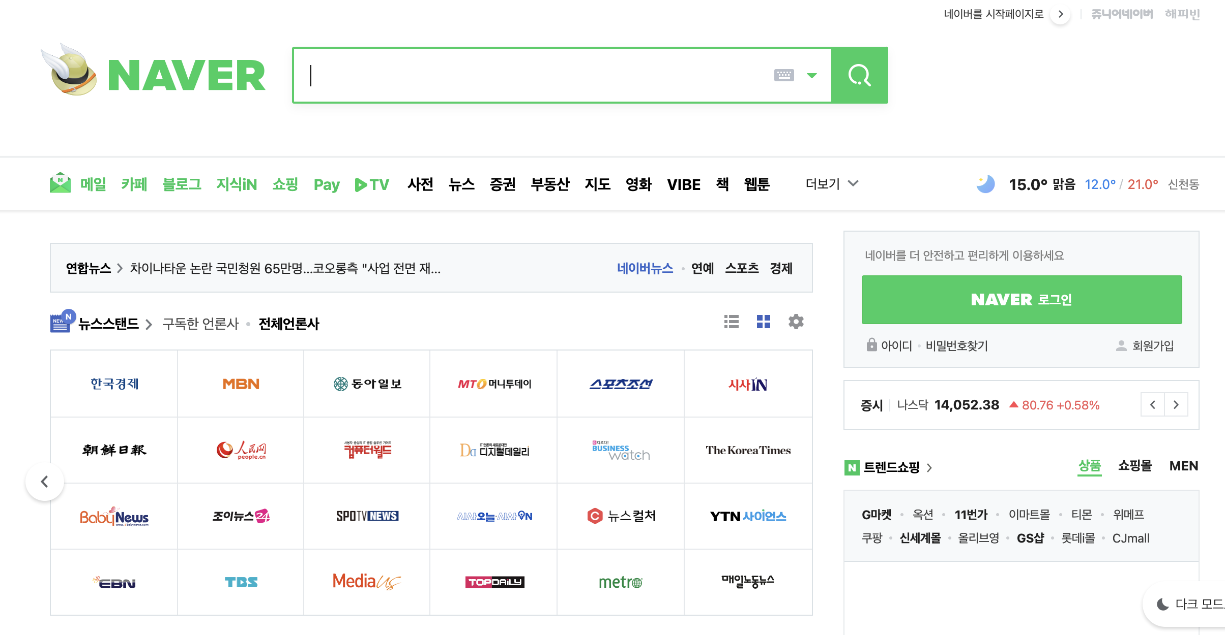 네이버 검색창 바로 아래에 위치한 메인 메뉴를 살펴보자. 총 16개의 메뉴가 한 줄에 있는데도 부담스럽지 않게 느껴진다. 유사성의 법칙을 이용하여 왼쪽의 초록색 메뉴가 7개, 오른쪽의 검은색 9개가 되도록 조절했다. 한편, 뉴스스탠드 선택, 쇼핑몰 선택처럼 depth가 깊지 않은 기존의 선호도가 뚜렷한 항목일 경우에는 10~20개의 선택지를 나열하더라도 대부분의 사용자가 빠르게 선택을 마칠 수 있다. 이렇게 많은 선택지 중 확고한 취향에 따라 선택해야 하는 상황에서는 힉스의 법칙을 무리하게 적용하지 않아도 좋다.