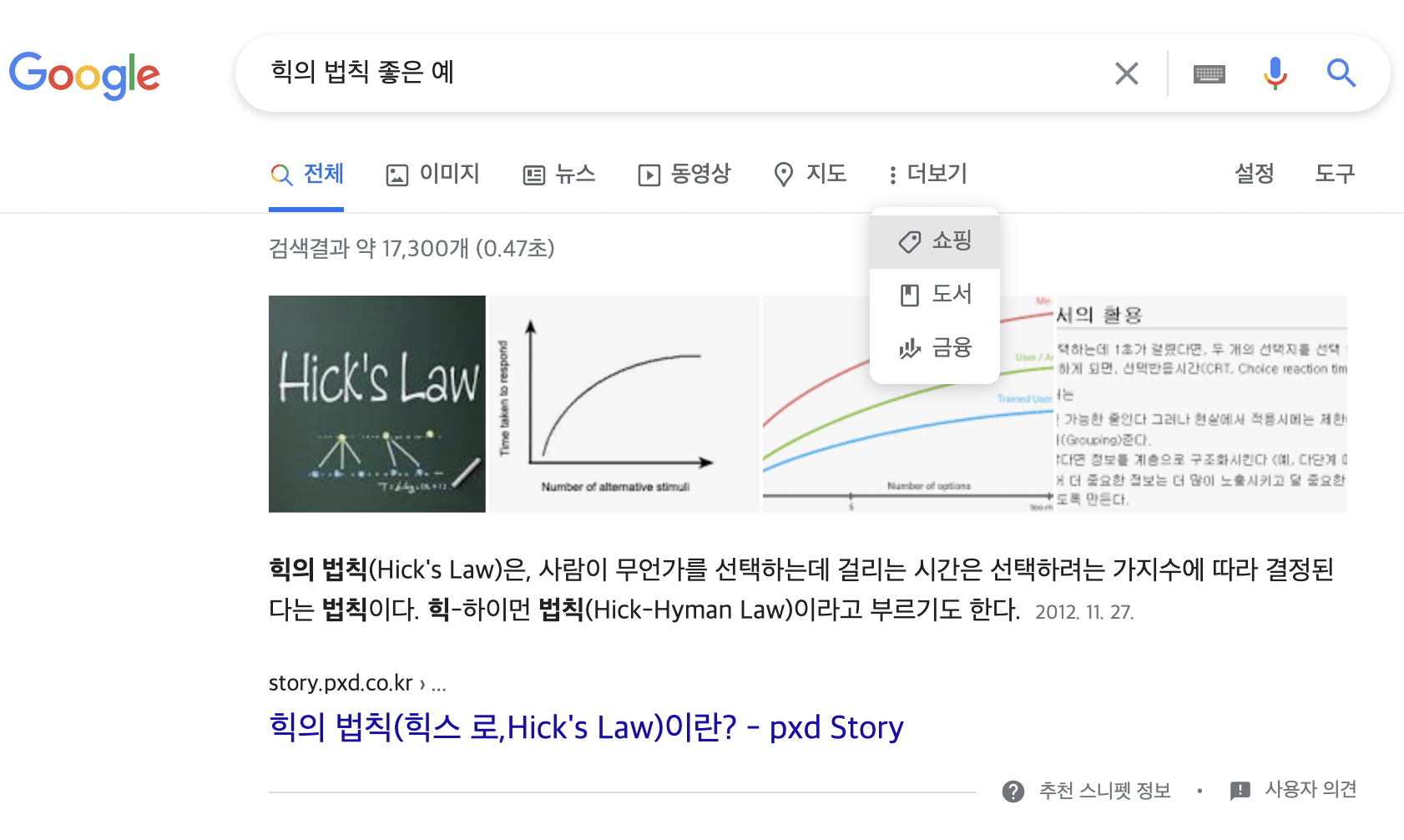 구글의 경우, '더보기'란에 메뉴를 숨기는 방식으로 선택지의 수를 조절하고 있다. 검색결과 기본옵션인 '전체검색' 외에 사용자에게 제공되는 선택지가 5개를 넘지 않도록 했다. 이렇게 중요도가 낮은 메뉴를 '더보기'로 제공해서 사용자의 빠른 선택을 도울 수 있다.