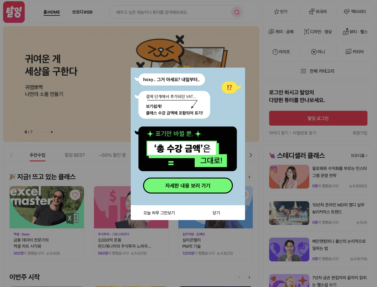 탈잉 웹사이트를 살펴보자. 정말 강조하고 싶은 정보는 랜딩페이지에 진입했을 때, 팝업 창이 아닌 모달창으로 제시할 수 있다. 예상하지 못한 모달창으로 사용자가 느낄 불편함을 최소화하기 위해 오늘 하루 그만보기 옵션을 제공하고 있다. 또 카카오톡 UI를 재현해서 사용자 친화적인 이미지로 내용을 저달하고 있다. 랜딩페이지도 시선이 지나치게 분산되지 않는 선에서 다양한 컨텐츠를 제공하고 있다.