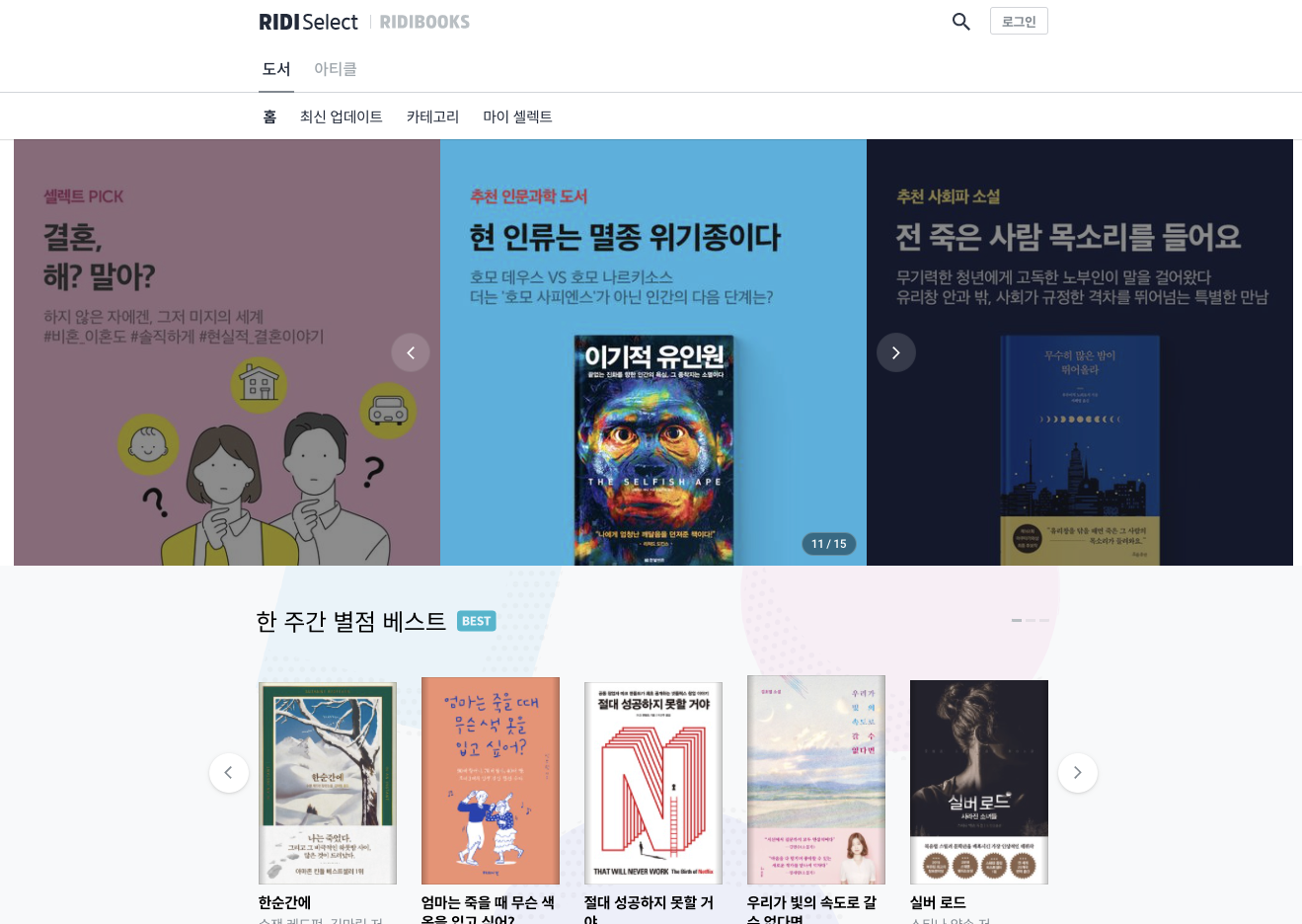리디북스 웹사이트의 경우, 화면 중앙에 캐러셀 애니메이션을 사용했는데, 캐러셀의 중앙에 표시되는 컨텐츠를 강조하되, 좌우 색상을 흐리게 표시해서 중앙의 컨텐츠에 사용자의 시선이 더 효과적으로 집중되도록 하고 있다.