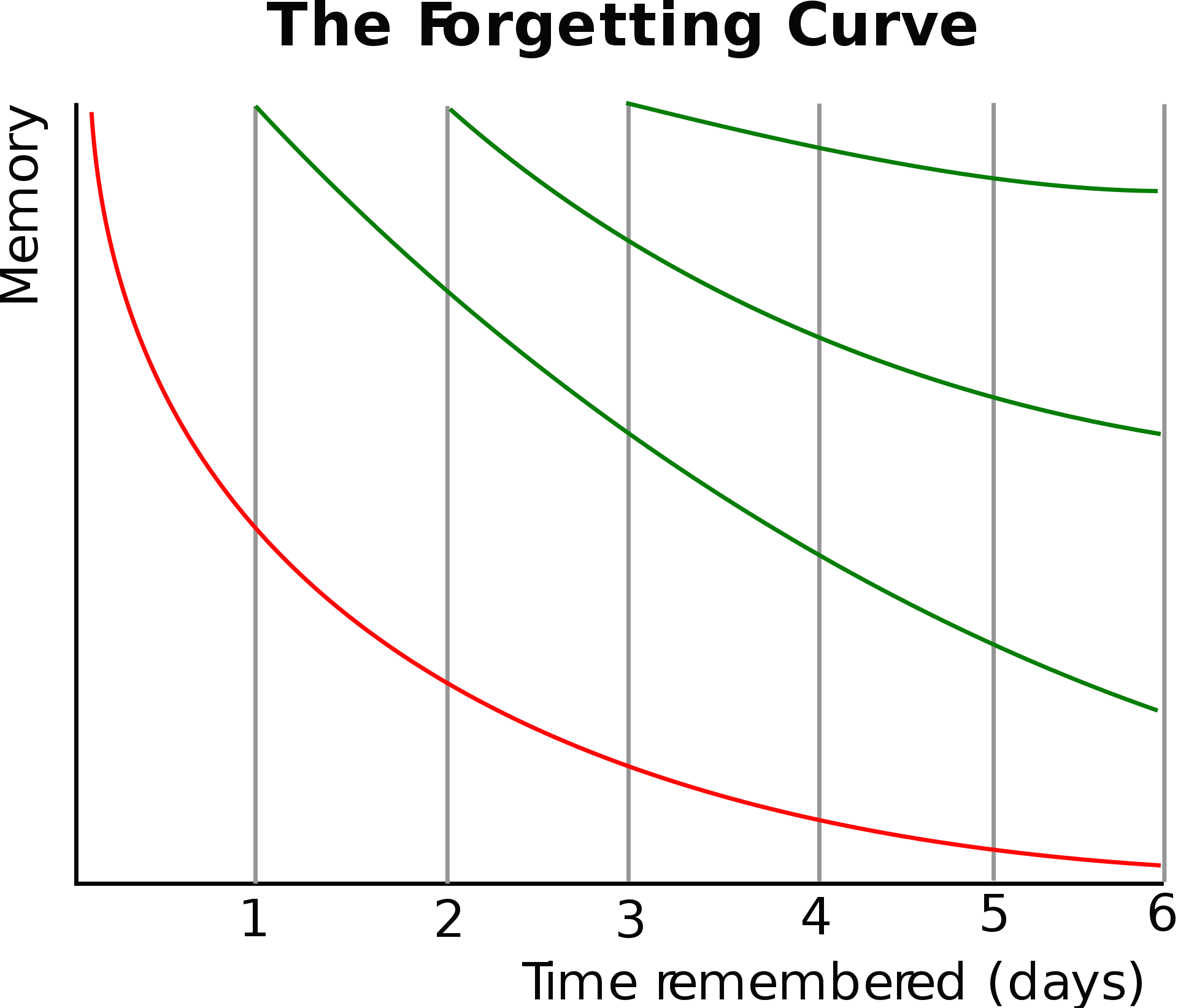 독일의 심리학자 헤르만 에빙하우스(Hermann Ebbinghaus)에 따르면, 인간의 기억은 다음과 같은 망각 곡선을 따른다. 단, 최초 학습 후 새로운 학습과 너무 비슷한 경험을 한다면 최초학습을 잊기 쉬울 수 있다. (간섭현상)