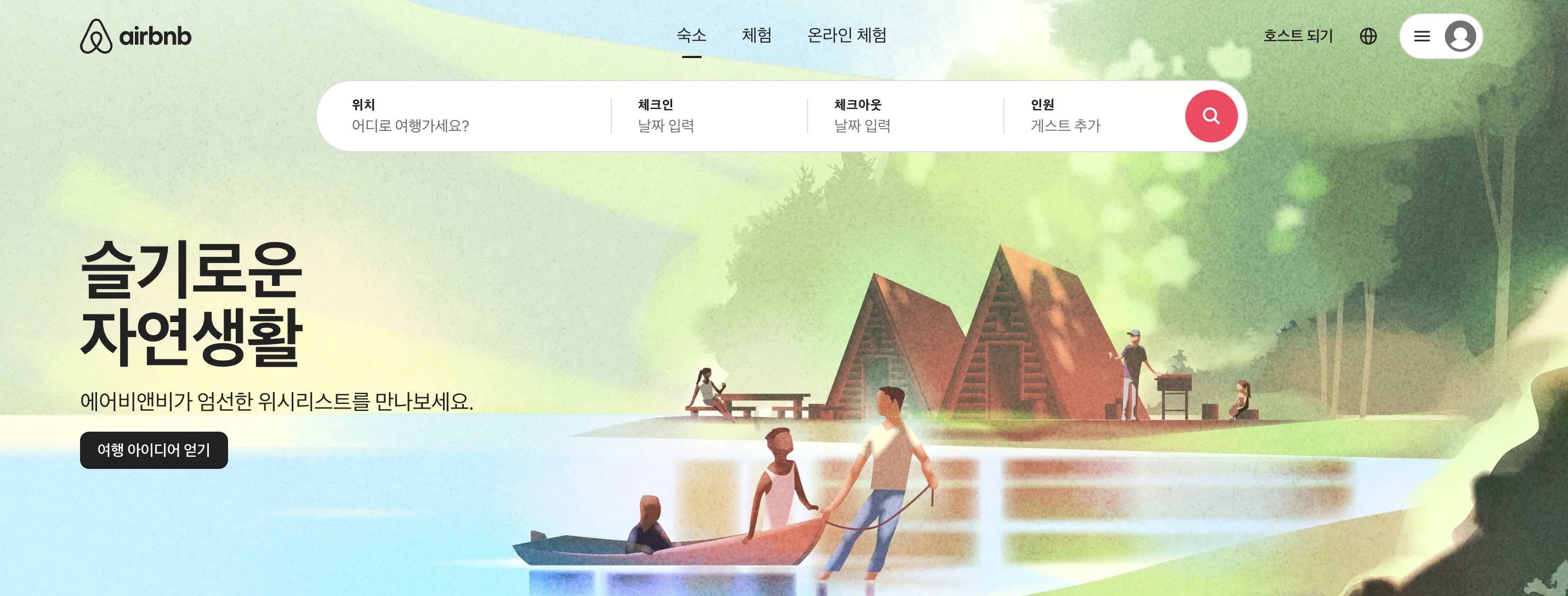 airbnb의 랜딩페이지는 와이드 일러스트레이션을 전면에 내세우고 있다. 사용자는 바쁜 도시생활을 벗어나 자연에서 평화로운 시간을 보내는 상황을 보며, 여행과 여유가 주는 긍정적인 감정을 떠올리게 된다. 이렇게 '좋아보이는' 일러스트레이션으로 사용자에게 긍정적인 인상을 암묵적으로 심어주면서 사용자로 하여금 긍정적인 감정을 갖도록 유도할 수 있다.