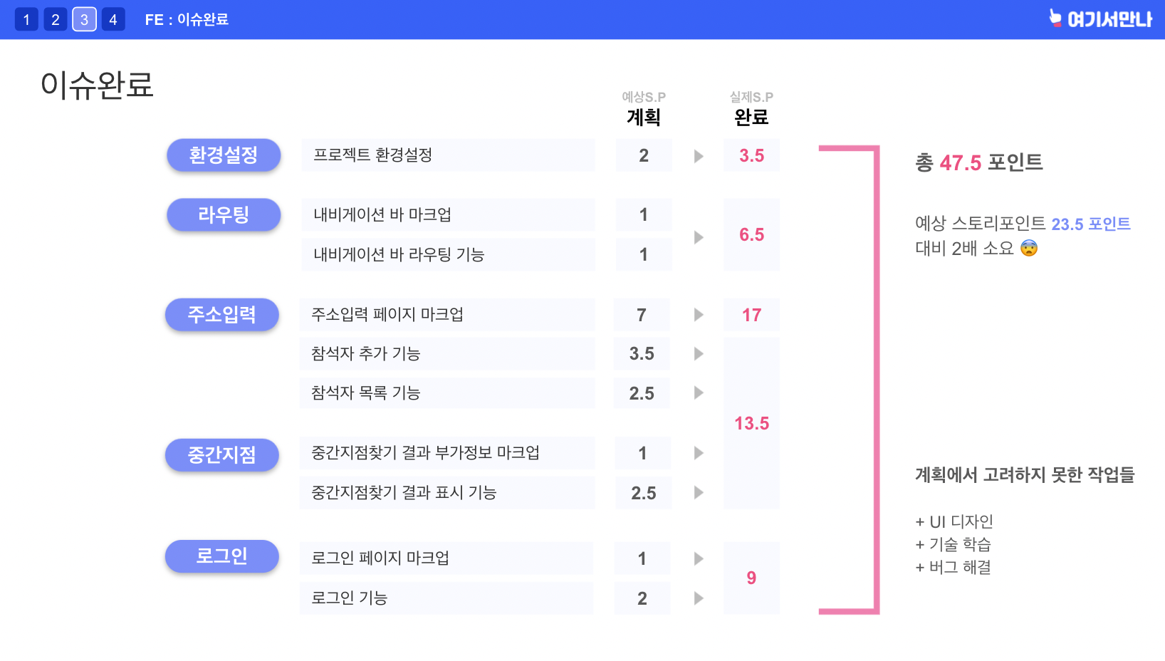실제로는 47.5 포인트가 소요되었다. 스토리 포인트를 추정하는 과정에서 미처 고려하지 못했던 것들이 많았다.