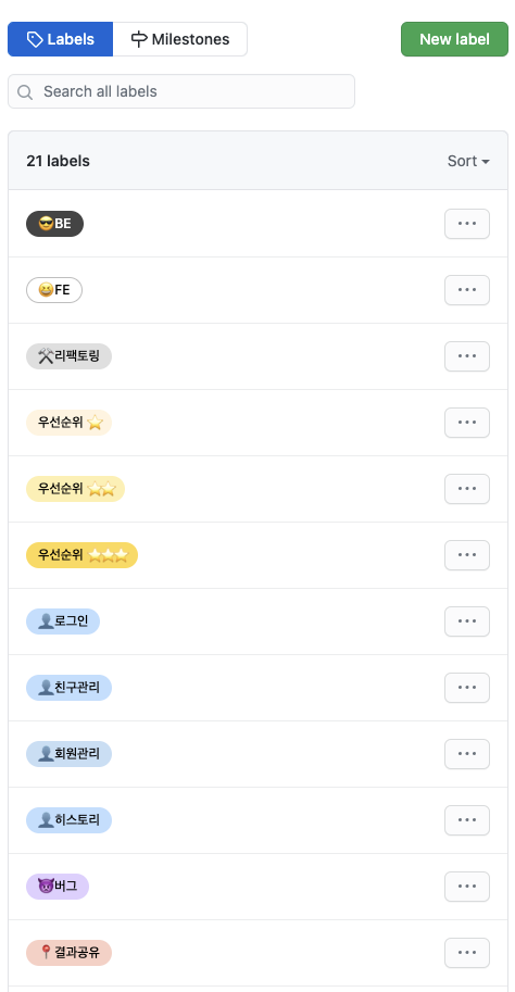 팀 repository에 우리 팀에게 필요한 라벨을 생성하고, 마일스톤도 등록했다. 그리고 이슈를 등록했다. 이슈의 제목 맨 앞부분에 대괄호에 산정한 스토리 포인트를 적는 것을 우리 팀의 이슈 제목 컨벤션으로 맞추었다.