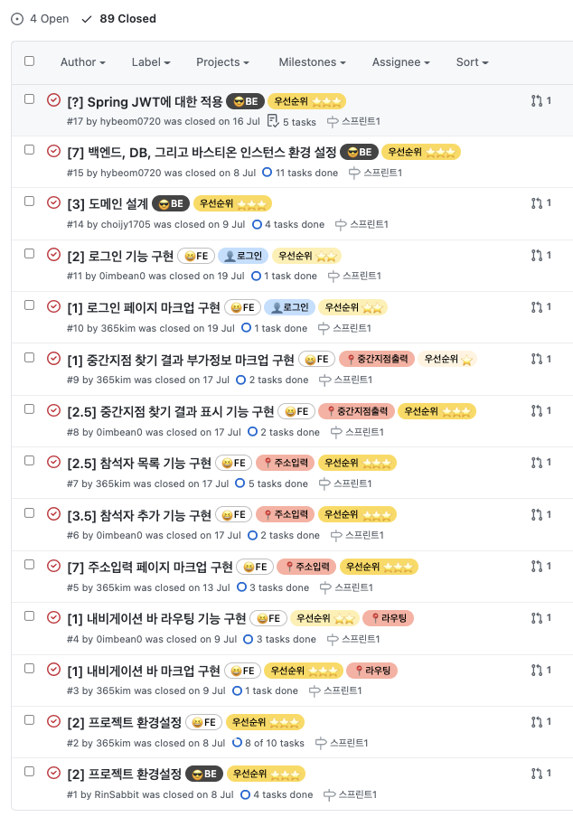 우선순위도 중요하다. 이슈에 대한 우선순위 관리가 잘 되어있어야지만 개인별로 작업 배분이 가능하다. 너무 빠르게 개발로 들어가려고 하지 마시고, 이슈들을 설계하는데 많은 시간을 투자했으면 좋겠다.