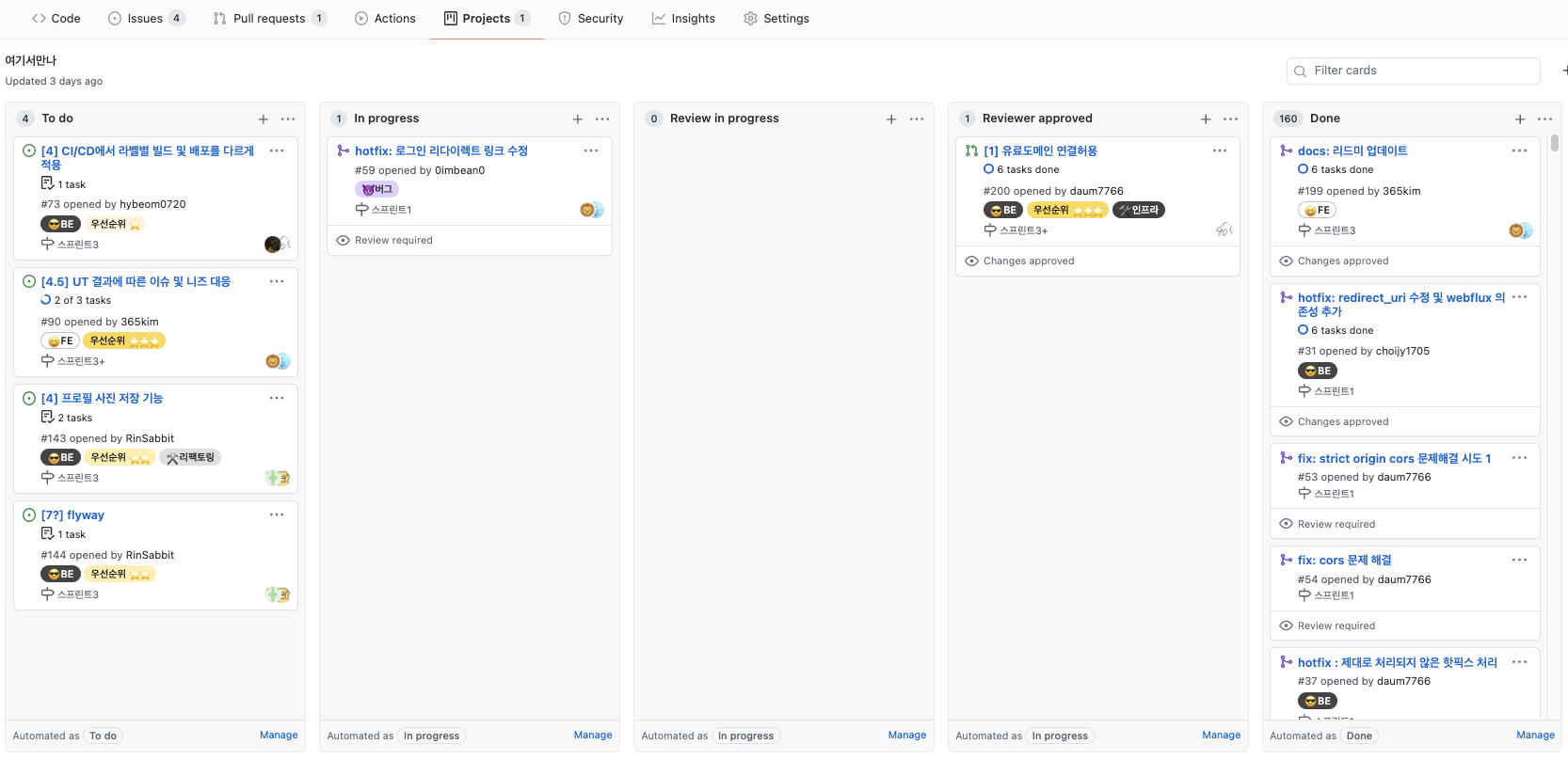 프로젝트의 진행 현황을 한눈에 파악할 수 있는 칸반 보드도 생성했다. Projects 메뉴에서 등록할 수 있다. PR이 올라오거나, 리뷰가 진행되거나 merge 되었을 때 등등 자동으로 카드가 이동되어 편리했다.