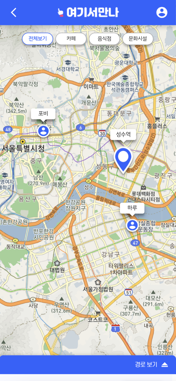 개발 초기부터 생각했던 디자인이라 UI 개발 자체에 큰 문제는 없었다. 코드로 UI를 구현하고 나니 미처 생각하지 못한 문제가 생겼다. 사진처럼 참석자 출발지 Pin이 가려지는 현상이 왕왕 발견되었다. Chip의 위치를 옮기기엔 저 위치가 너무도 최적의 위치이다 보니 지도의 boundary를, 지도의 배율에 따라 Chip의 마진 + 높이만큼 수동으로 buffer를 주는 코드를 추가해서 해결했다.