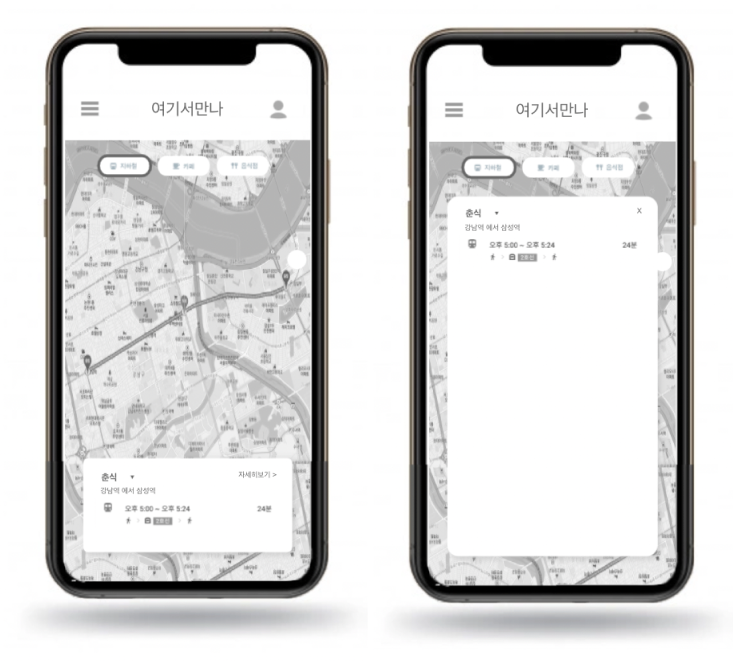 모바일에서는 한정된 화면 크기로 인해 '지도'와 '경로 정보'를 한 번에 표시할 수 없었다. 고민 끝에 Drawer 를 추가하는 방식으로 표현하기로 결정했다. 스르륵 올라오는 애니메이션을 넣어주니 꽤 앱스러운(?) 느낌이 나서 만족스러웠다.
