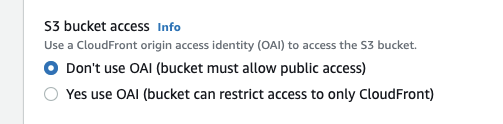 [S3 bucket access] 에서 'Yes use OAI'를 선택하고 'Create new OAI' 버튼 클릭해서 Create 한다. OAI(Origin Access Identity)의 줄임말이다. 'Yes, update the bucket policy'를 선택한다.