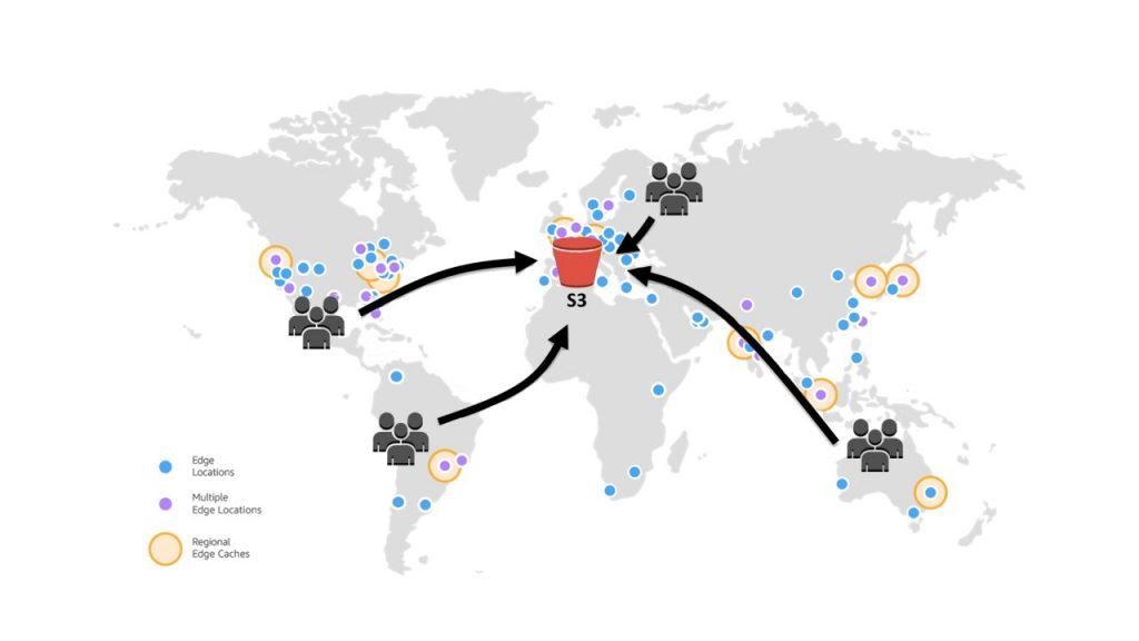 CloudFront에서 얘기하는 엣지 로케이션(Edge Location)은 전 세계 데이터 센터를 가리킨다. 만약 사용자가 CloudFront를 통해 서비스하는 콘텐츠를 요청하면, 지연시간이 가장 낮은 엣지 로케이션으로 요청이 라우팅된다. 따라서, 사용자의 요청이 통과하는 네트워크의 수가 줄어들고 데이터 전송 속도가 빨라져 더 짧은 지연 시간으로 콘텐츠를 전송할 수 있게된다.