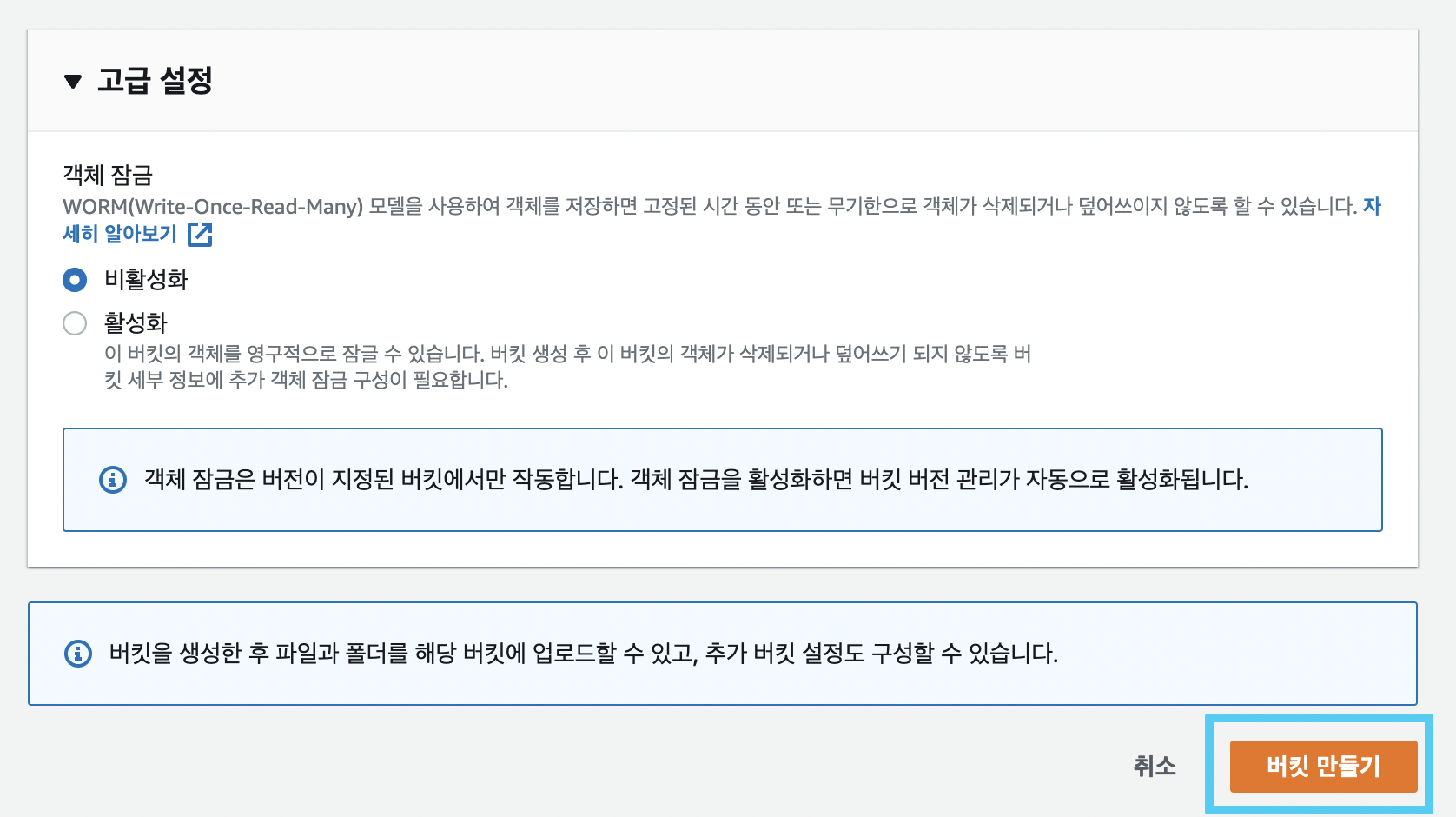 S3 객체 잠금을 사용하면 객체가 write-once-read-many 모델로 저장된다. 객체를 삭제하거나 덮어쓰지 않도록 보호하고 싶은 경우 사용한다. 해당사항이 없으니 skip