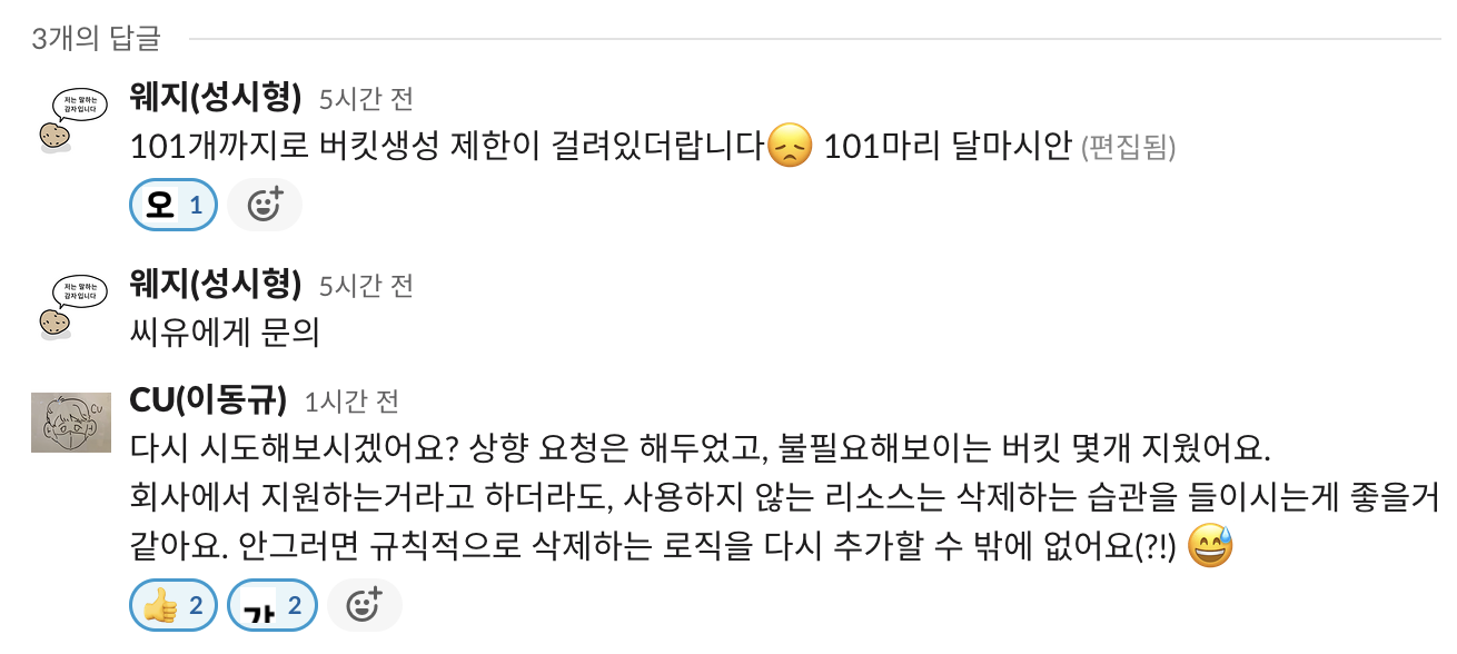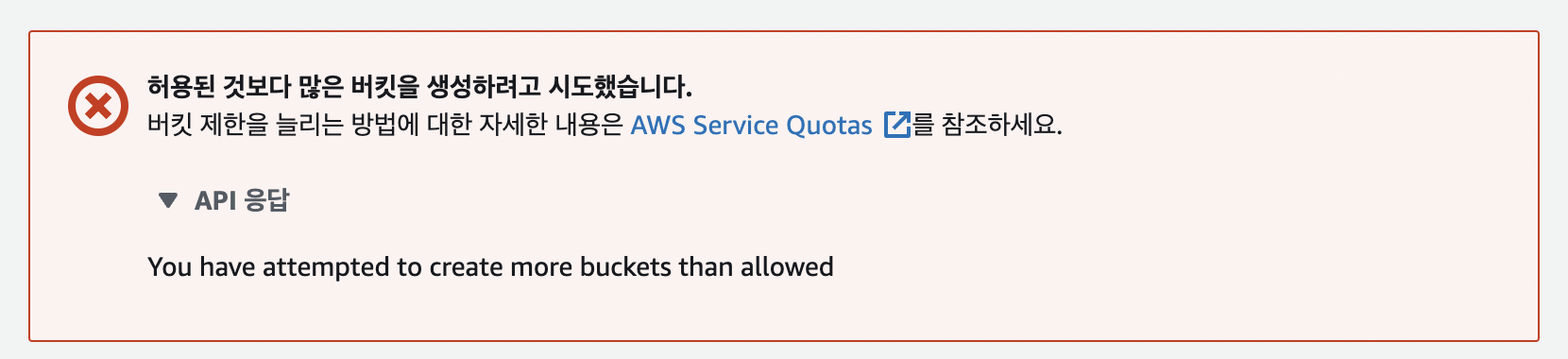 필요한 모든 설정을 마치고 [버킷 만들기] 버튼을 클릭하면, 앗... 에러가 떴다.