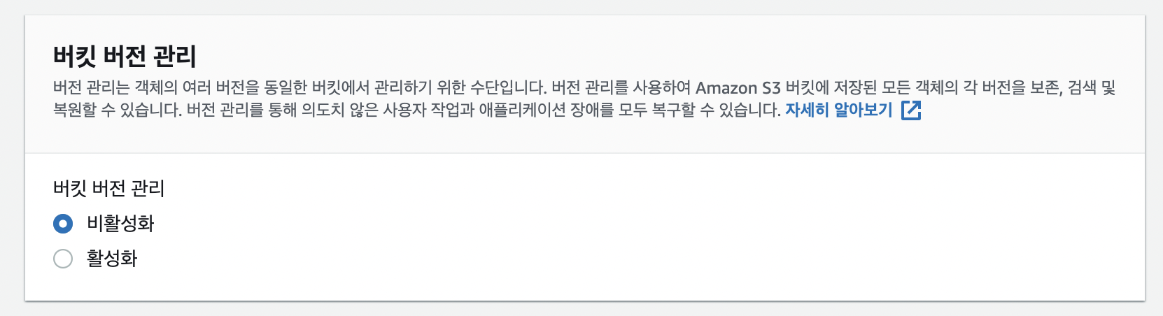 버전 관리를 사용하면 하나의 버킷에 여러 버전의 객체를 보관할 수 있다. 기본값은 버전관리를 사용하지 않는 것이다. 객체를 하나만 만들 예정이니 비활성화로 유지하자.