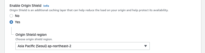 [Enable Origin Shield] 에서 'Yes'를 선택한다. Origin Shield region은 'Asia Pacafic (Seoul) ap-northeast-2'로 설정해준다.