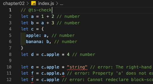 자바스크립트 파일 전체에서 타입체크를 수행한다. 파일 최상단에 써야 효력이 발생한다.