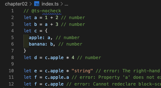 타입스크립트 파일 전체에서 타입체크를 수행하지 않는다. 파일 최상단에 써야 효력이 발생한다.