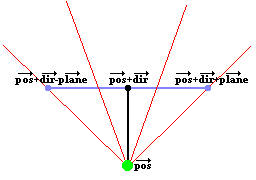화면에서 특정 x 좌표의 특정 광선은 이 플레이어 위치에서 시작하여 화면의 해당 위치 또는 카메라 평면을 통과하는 광선입니다. 진짜 3D 엔진은 3차원을 다루므로 벡터 2개가 필요하지만. 2차원 맵을 다루는 레이캐스팅 은 카메라평면이 진짜 평면이 아니고 선이므로 벡터 1개로 표시합니다.