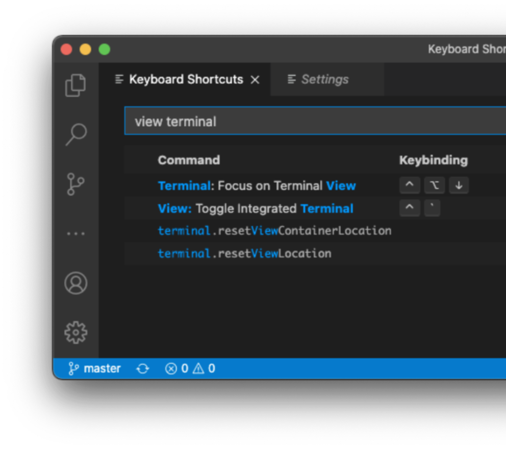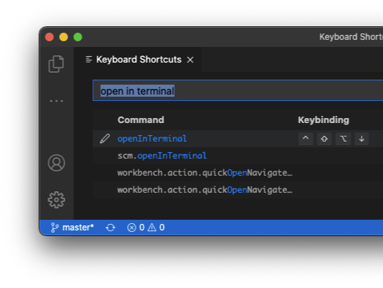 'openInTerminal'은 현재 활성화된 에디터 위치를 터미널에서 열어준다. 별도의 마우스 조작이나 cd 명령어 없이 터미널을 필요한 경로로 바로 설정할 수 있어 편리하다. 터미널로 초점을 옮기는 조합에 Shift 키만 추가한 조합으로 설정해두었다.