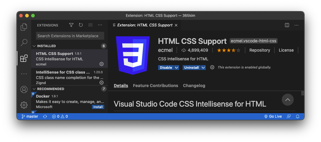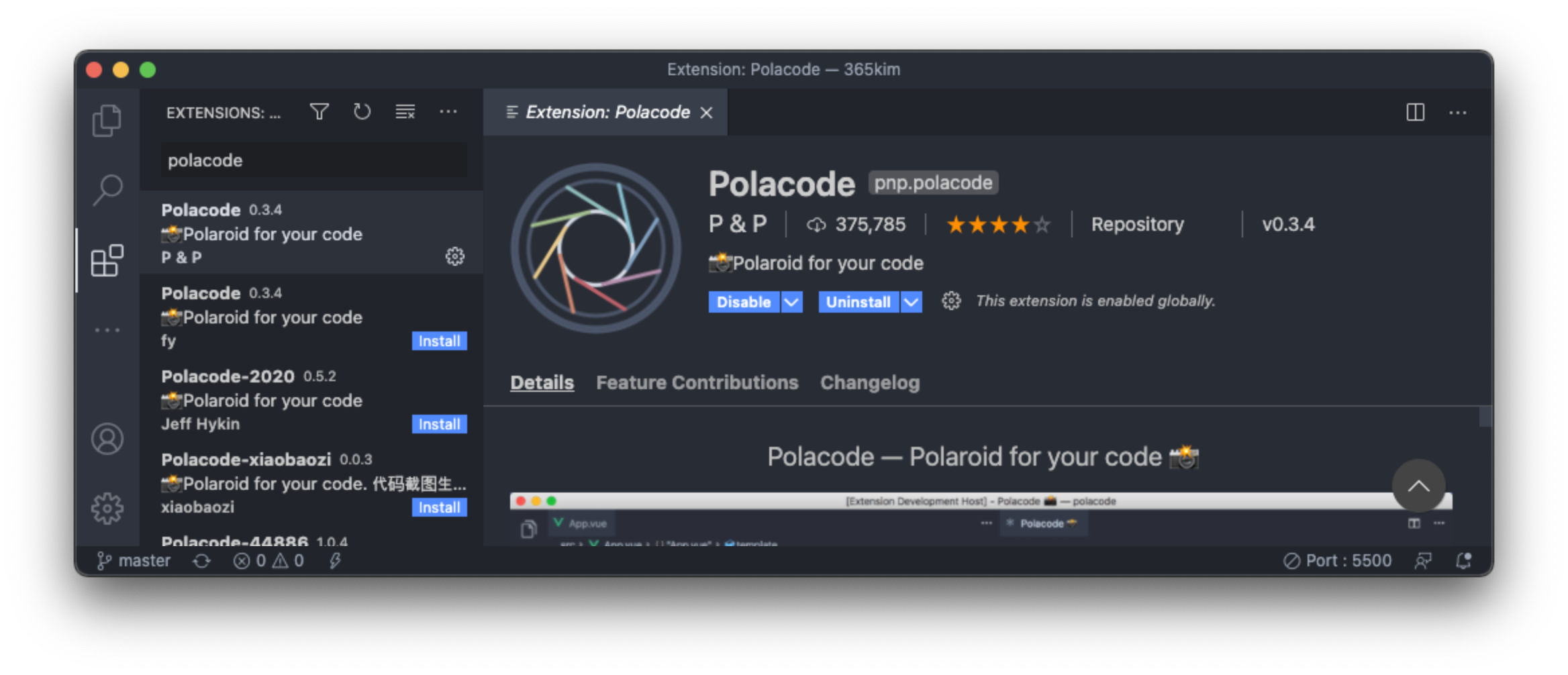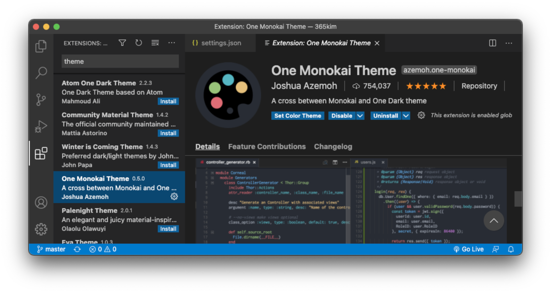 좌측 Extension 탭에서 theme이라고 검색하면 다양한 테마를 골라볼 수 있다. Install 버튼을 누르면 자동으로 적용된다. 대부분 스크린샷으로 예시를 보여주고 있는데 그렇지 않다면 Install 해서 확인하는 것도 방법이다. 마음에 들지 않는다면 Uninstall 버튼으로 쉽게 삭제할 수 있고, 여러 가지 테마를 설치해두고 원할 때 설정을 변경할 수도 있다.