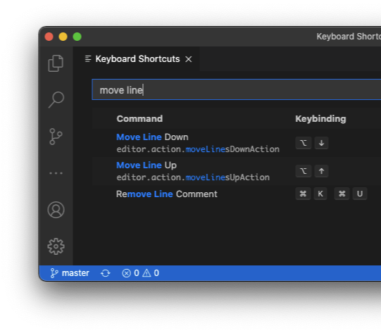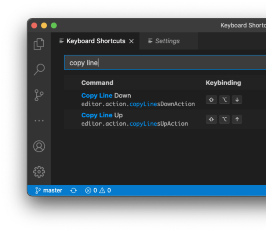 라인을 복사해주는 'Copy Line Down', 'Copy Line Up'과, 라인을 이동해주는 'Move Line Down', 'Move Line Up'은 단축키 기본 설정 그대로 사용하지만 자주 쓰기 때문에 추가해보았다.