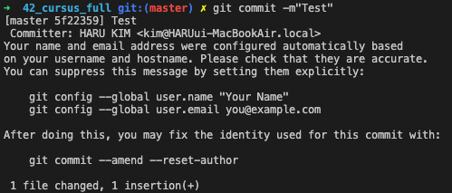 코드를 작성한 후 나의 깃허브 저장소에 커밋하려고 하면 다음과 같은 메세지가 나온다. Committer(커밋한 사람)를 컴퓨터에 설정된 사용자 이름과 이메일 주소로 자동으로 설정했는데 그게 맞는지 한번 확인해보라는 내용이다. 컴퓨터 사용자 정보와 나의 깃허브 계정 정보가 다르기 때문에 이 상태에서 커밋을 올리게 되면 내 깃허브 아이디가 아닌 다른 사용자가 올린 것이 돼버린다.