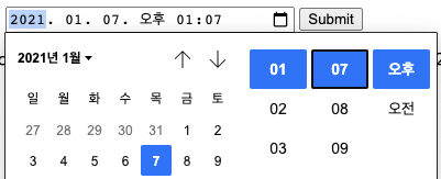 | type="datetime-local" | <input>을 Date Picker & 시간입력 필드로 지정한다. (no time zone)![]() |