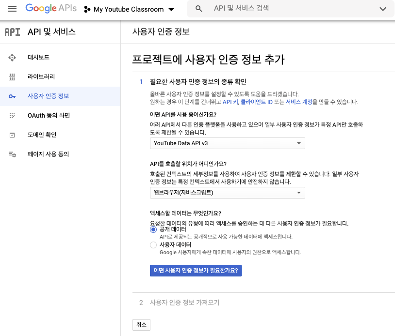 조금 기다리다 보면 하단 왼쪽 그림과 같이 화면이 표시된다. '사용자 인증 정보 만들기' 를 클릭하면, 마지막 단계인 사용자 인증 정보를 입력하는 단계로 넘어간다. 사용할 API는 'Youtube Data API v3', 호출할 위치는 '웹브라우저(자바스크립트)', 액세스 할 데이터는 '공개 데이터'로 선택하고 하단 중앙 그림을 참고해서 빠르게 눌러보자.