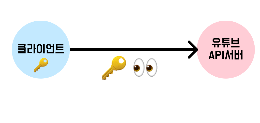 앞서 이야기했듯 API 키는 보안을 잘 유지하며 관리해야 한다. 하지만 [왼쪽 그림] 과 같이 클라이언트 측에 KEY를 보관하고, 클라이언트가 유튜브 서버로 바로 요청을 보내는 방식으로는 KEY를 숨길 수 없다. 요청URL에 '&key=MY_API_KEY'와 같은 형태로 내 API 키가 반드시 들어가기 때문에 공개될 수밖에 없다. 그러므로 KEY를 숨기기 위해서는 클라이언트가 아닌 곳에 KEY를 보관해야 한다.