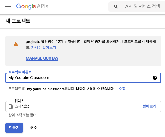 API를 사용하기 위해서는 먼저 key를 발급받아야 하고, key를 발급받기 위해선 구글 계정이 필요하다. 인증 없이는 대부분의 API를 사용할 수 없어서 구글 계정이 반드시 필요하다. 구글 계정이 준비되었다면 구글 개발자 콘솔(Google Dev Console) 로 접속하고 하단 왼쪽 그림과 같이 새 프로젝트를 생성한다. 만들기 버튼을 누르면 잠시의 로딩 끝에 하단 오른쪽 그림과 같이 프로젝트 생성이 완료된다. 'API 및 서비스 사용 설정'을 클릭하자.