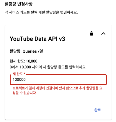 YouTube API는 무료이기 때문에 결제정보(Payment Info)를 제출하지 않아도 잘 작동한다. 다만 사용에 요청을 얼마나 보낼 수 있는지 제한이 있다. 일정 포인트를 할당해주고, 요청을 보낼 때마다 포인트를 차감하는 방식이다. 이 할당량을 Quotas로 표현하는데 그냥 쉽게 포인트라고 얘기하자. 소요 포인트의 양은 어떤 종류의 요청을 보내는지에 따라 다르다. 예를 들어, 영상 목록을 조회할 때는 100 포인트가 소요되는데, 요청에 따라 여러 페이지를 조회하게 된다면 조회한 페이지 수만큼 각각 포인트가 소요된다. 댓글을 추가하는 요청은 50 포인트가 소요된다. 가장 많은 포인트가 소요되는 동영상 추가 요청은 1,600 포인트가 소요된다. (요청별 포인트 소요 더보기)