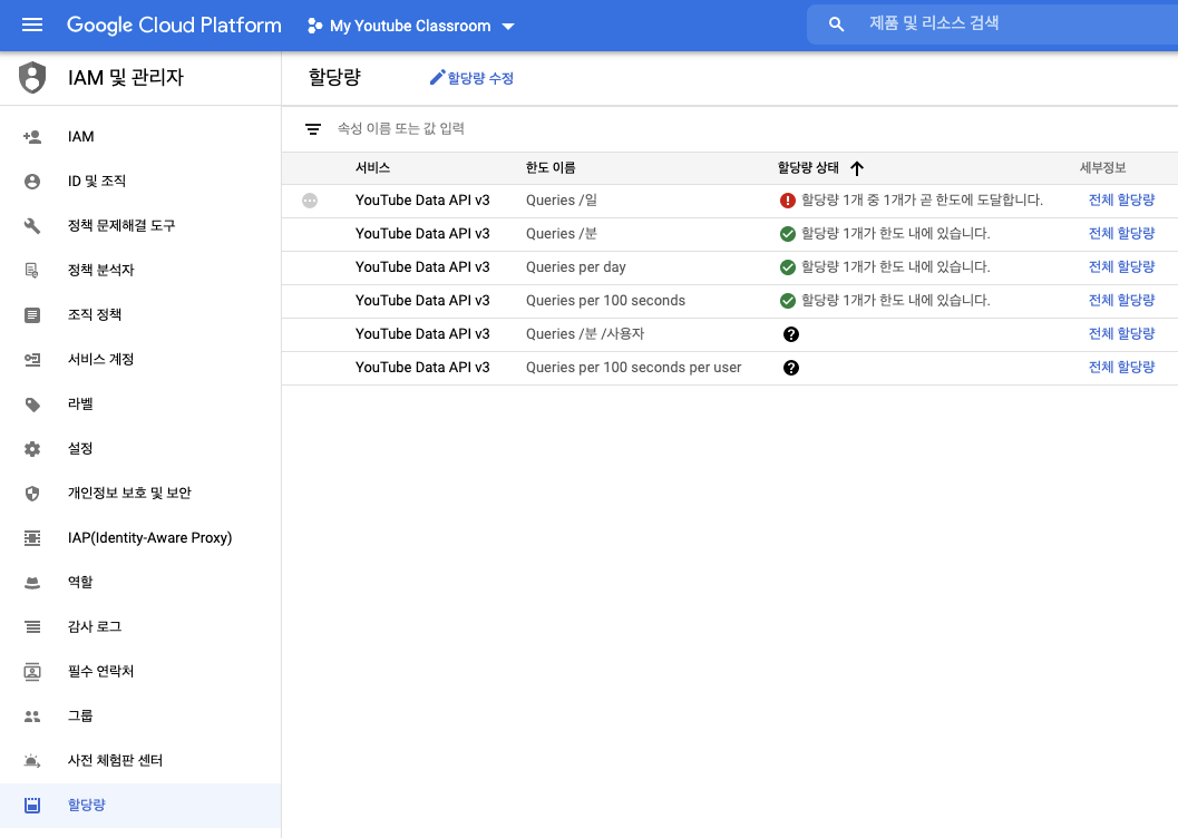 유튜브 API에서 무료로 사용 가능한 포인트 한도가 얼마인지 확인해보자. IAM 및 관리자 메뉴 - 할당량(Quotas) 에서 일일 요청한도가 10,000 포인트, 1분당 요청한도 1,600 포인트로 설정되어있는 것을 확인할 수 있다. 유튜브 API를 통해 하루에 영상을 100페이지 초과해서 비디오를 받아오거나, 1분 동안 동영상을 1개 초과해서 동영상을 추가할 수 없다는 이야기이다.