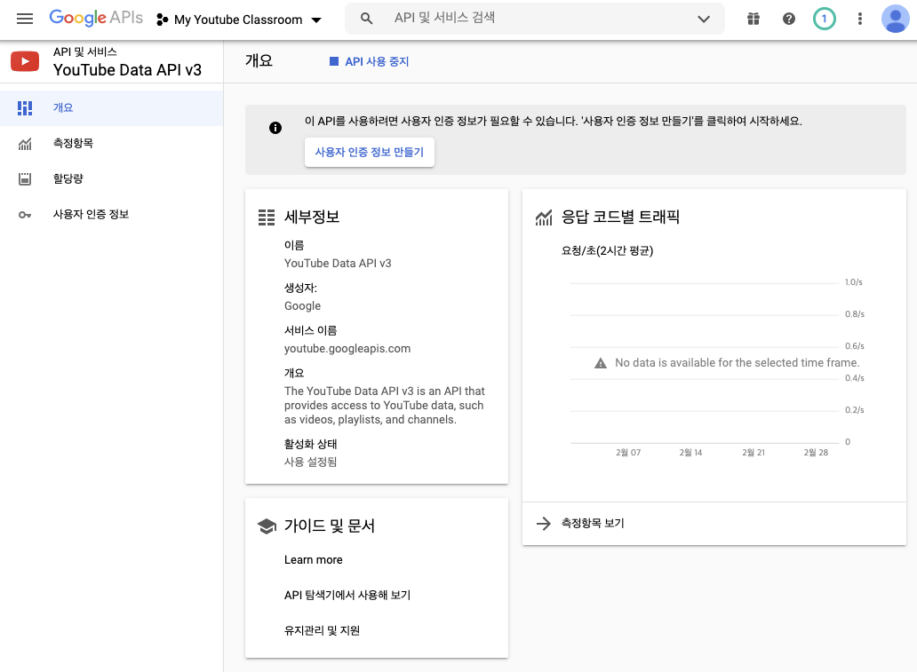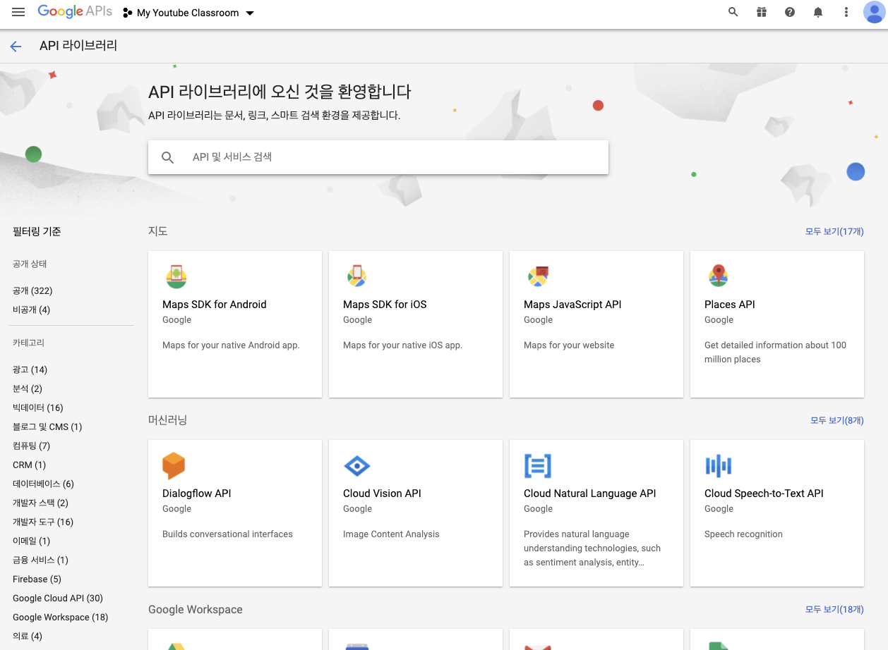 'API 및 서비스 사용설정'을 클릭하면, 하단 왼쪽 그림과 같이 활성화(enable)할 수 있는 모든 API를 볼 수 있다. API 중에는 완전 무료인 API도 있고 유료인 API도 있다고 한다. 'youtube'라고 검색해서 유튜브 API 를 찾아보자. 휠을 조금만 내려도 바로 보인다. 'Youtube Data API v3'를 선택하고 '사용(Enable)' 버튼을 누른 후 잠시의 로딩을 기다린다.